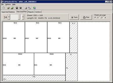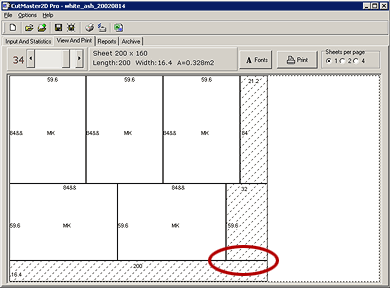Curso del CutMaster 2DVer e impresiónDespués del cálculo usted puede ver disposiciones del corte. Los excesos pueden ser cambiados antes de imprimir simplemente chascando en ellas.
